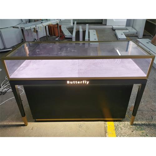 片尺寸价格说明定做服务。珠宝展柜的款式参考珠宝品牌海瑞温斯顿的设计,采用了黑色加金色的组合搭配,展柜主体框架为拉丝不锈钢经刨槽折弯、激光切割、无缝焊接、抛光打磨等5道工序加工精制而成,下方柜体为木基层夹板钉装黑色半哑光漆饰面。