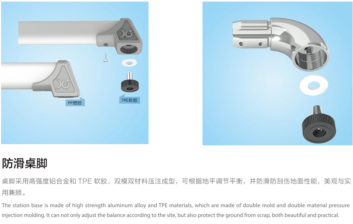 5.桌/椅脚掌:1.5mm壁厚,铝合金脚套底有4个平衡调节机构。