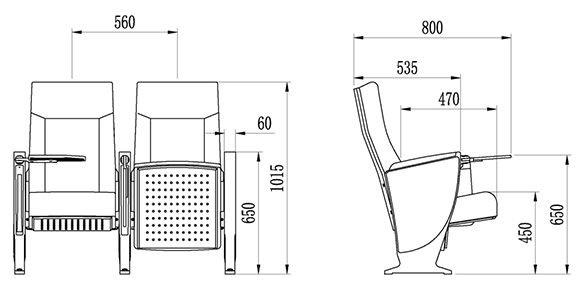 2.座椅基本中心距为560±10mm,座包打开侧深470±10mm,写字板打开侧深800±10mm,椅高为1015±10mm,最小排距:900 mm。